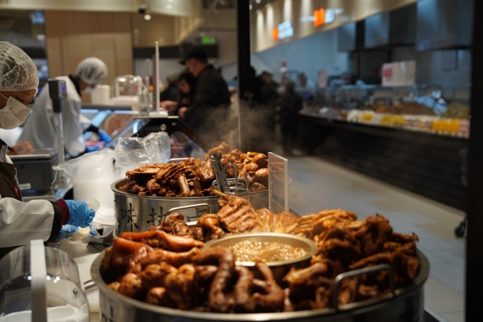 熟食區(qū)新增多個美食檔口,包括北京烤鴨、現(xiàn)炒板栗、奧爾良烤雞、三文魚壽司、手工包點、披薩、涼皮等新品,大大增強了賣場的“煙火氣”。