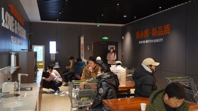 服務(wù)的溫度藏在每一個細節(jié)里。食品貨架旁擺放著老花鏡和放大鏡;連卷袋處貼心設(shè)置了濕手器;冷鏈區(qū)域為顧客準備了防凍手套;購買整個西瓜、榴蓮、椰青等,可享免費現(xiàn)切、剝殼服務(wù);肉禽柜臺支持免費切絲、切片、絞肉、剔骨;海鮮區(qū)可提供宰殺、清洗、打氧服務(wù),甚至未來還將上線免費代蒸服務(wù)。便民服務(wù)區(qū)宛若一個“社區(qū)生活服務(wù)站”:配備了身高體重測量儀、血壓儀、溫水洗手池、直飲水機、微波爐、免費茶飲、前一小時免費充電寶,更特別增設(shè)了寵物安置區(qū)和配有桌椅的顧客休息區(qū),方便“邊吃邊逛”。