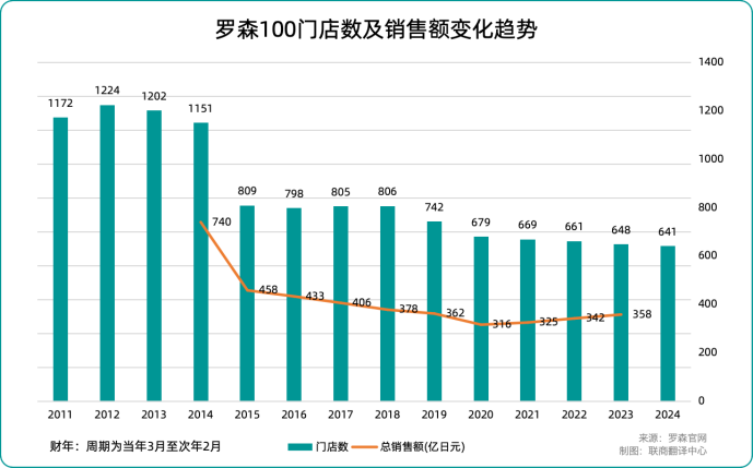 最終,“羅森100”陷入明顯的結(jié)構(gòu)性壓力之中。目前,真正以100日元(約合人民幣4.5元)銷售的商品僅占整體約兩成。2025年11月,其同店銷售額同比下降4.4%,已連續(xù)25個月負(fù)增長。門店數(shù)量也從高峰期的1200多家,縮減至604家。