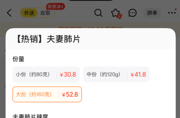 12月26日,雷達(dá)財(cái)經(jīng)通過(guò)某外賣平臺(tái)了解到,在紫燕的一家線上外賣店中,一份160克的夫妻肺片原價(jià)為52.8元,按此計(jì)算,其每斤價(jià)格再次上漲,達(dá)到165元。