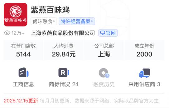 然而,近年來(lái),紫燕食品“快速開店,搶占市場(chǎng)”的策略似乎逐漸失效。窄門餐眼數(shù)據(jù)顯示,截至今年12月15日,紫燕食品的門店數(shù)量已經(jīng)萎縮至5144家。