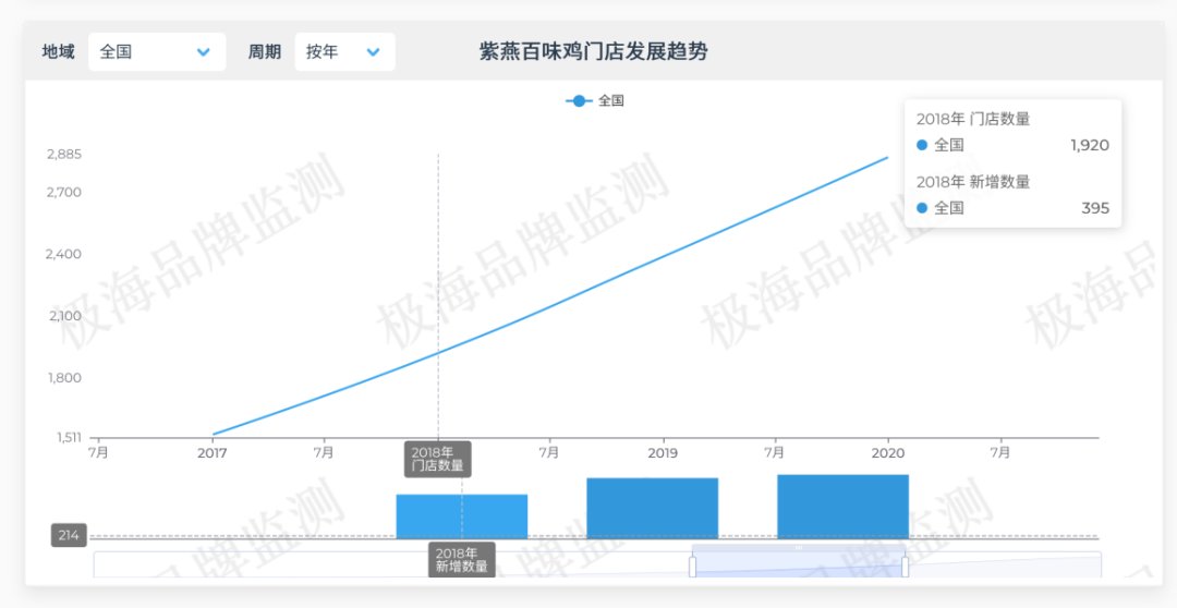 憑借著這種經(jīng)銷模式,紫燕食品一度實(shí)現(xiàn)迅猛擴(kuò)張。極海品牌監(jiān)測(cè)數(shù)據(jù)顯示,2018年,紫燕門店數(shù)量尚不足2000家。而據(jù)公司官網(wǎng)披露數(shù)據(jù),到2023年末,紫燕門店數(shù)量在短短幾年時(shí)間內(nèi)已攀升至6205家。