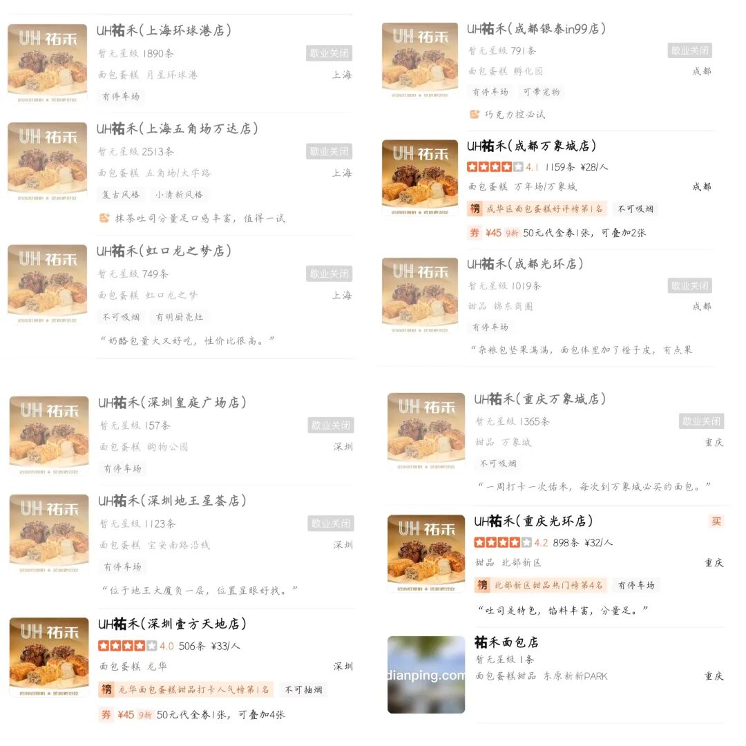 值得注意的是,目前祐禾在上述城市均有門店仍在營(yíng)業(yè)中,品牌并沒有撤出。以上海為例,關(guān)了三家門店后,仍有12家門店正常經(jīng)營(yíng)。