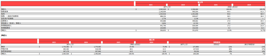 根據(jù)財(cái)報(bào),第三季度,lululemon美洲市場(chǎng)凈營(yíng)收同比下降2%至17億美元(約合人民幣118.78億元),可比銷(xiāo)售額下降5%;中國(guó)大陸市場(chǎng)凈營(yíng)收同比大漲46%至4.65億美元(約合人民幣32.49億元),可比銷(xiāo)售額同比增長(zhǎng)24%,成為拉動(dòng)全球增長(zhǎng)的絕對(duì)核心;其他國(guó)際市場(chǎng)凈營(yíng)收同比增長(zhǎng)19%至3.672億美元(約合人民幣25.66億元),可比銷(xiāo)售額增長(zhǎng)9%。