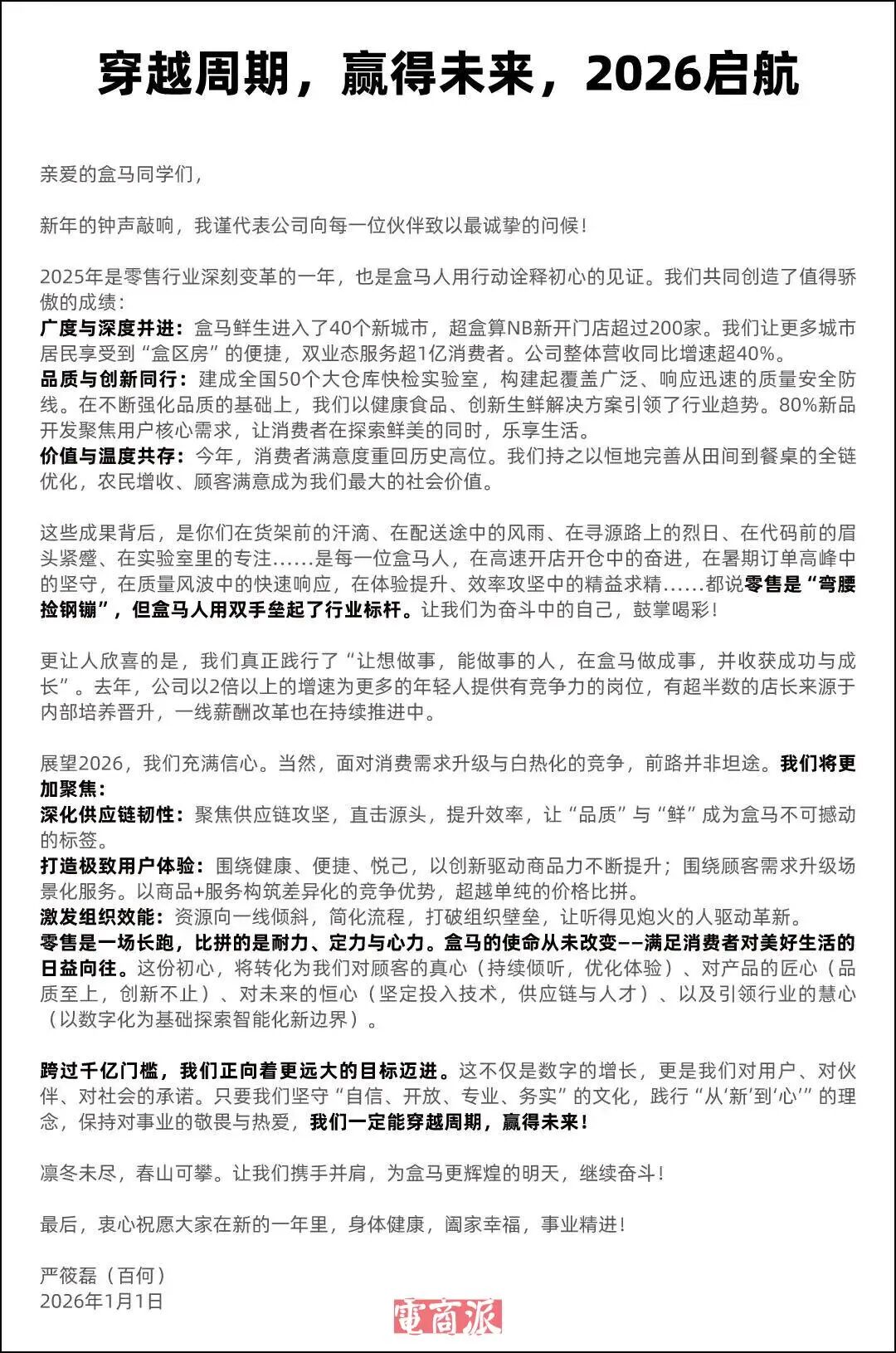 2026年元旦,盒馬CEO嚴筱磊的新年全員信在零售圈刷屏:2025年盒馬整體營收同比增速超40%,盒馬鮮生與超盒算NB雙業(yè)態(tài)服務超1億消費者。