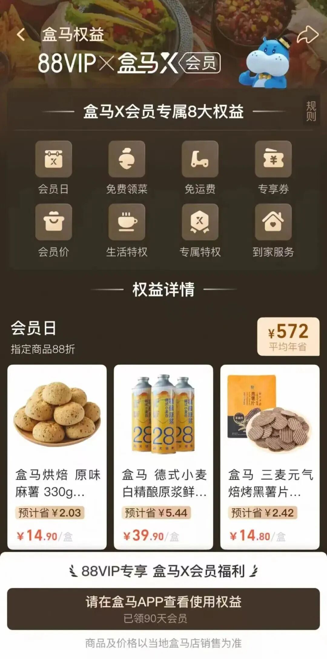 會員體系的打通成為流量增長的新引擎。2025年8月,阿里巴巴88VIP會員中心推出新權益,即免費領取90天盒馬X會員。這為盒馬帶來了大量的優(yōu)質增量客戶,會員數(shù)飆升。