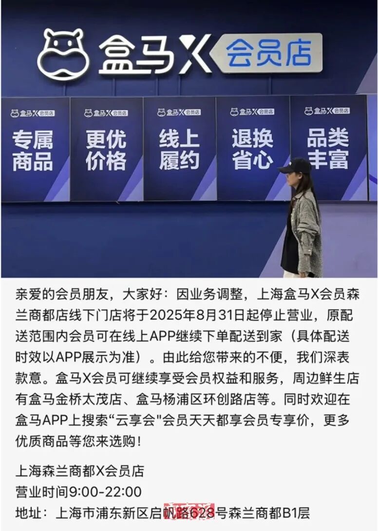調整過程中,關閉X會員店是戰(zhàn)略轉折點。2025年8月,盒馬徹底退出會員店賽道,將資源集中于更成熟、回報更清晰的業(yè)務。