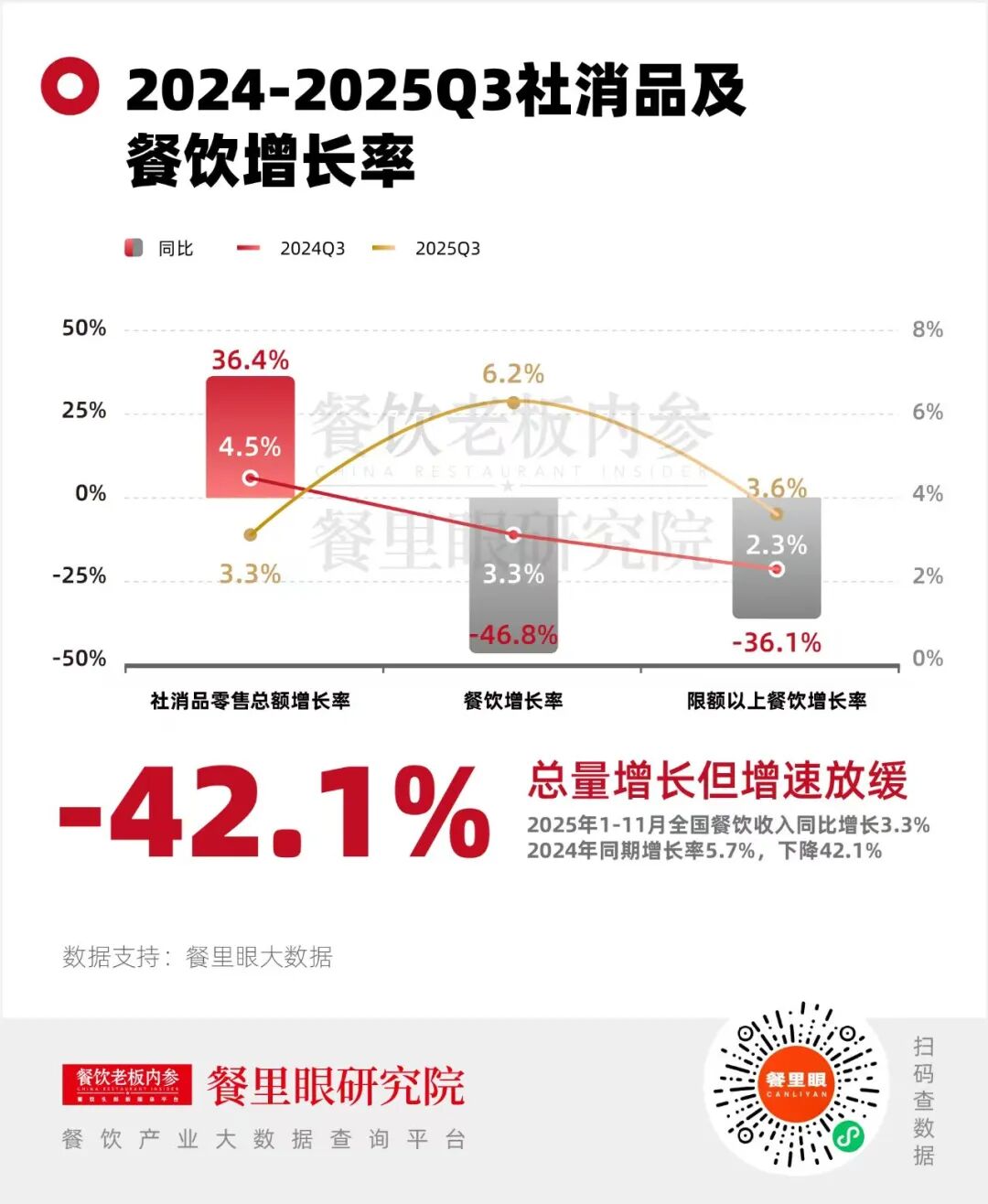 >2025年1-11月的全國餐飲收入較去年同期增長了3.3%,而2024年同期增長率為5.7%,2025年比2024年增速同比下滑了42%。這意味著,盡管營收總額在增長,但單店盈利能力大幅下滑。