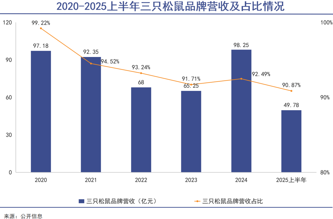 長(zhǎng)期以來,三只松鼠品牌的營(yíng)收一直占其總營(yíng)收的90%以上,其他子品牌仍處于孵化階段,貢獻(xiàn)有限。直至2025年上半年,三只松鼠品牌的休閑零食依然是公司的核心收入來源。