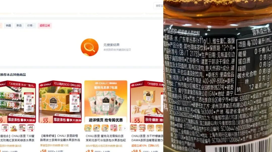 CHALI旗艦店無在售瓶裝茶產(chǎn)品、CHALI瓶裝產(chǎn)品 圖源:天貓平臺(tái)、網(wǎng)絡(luò)