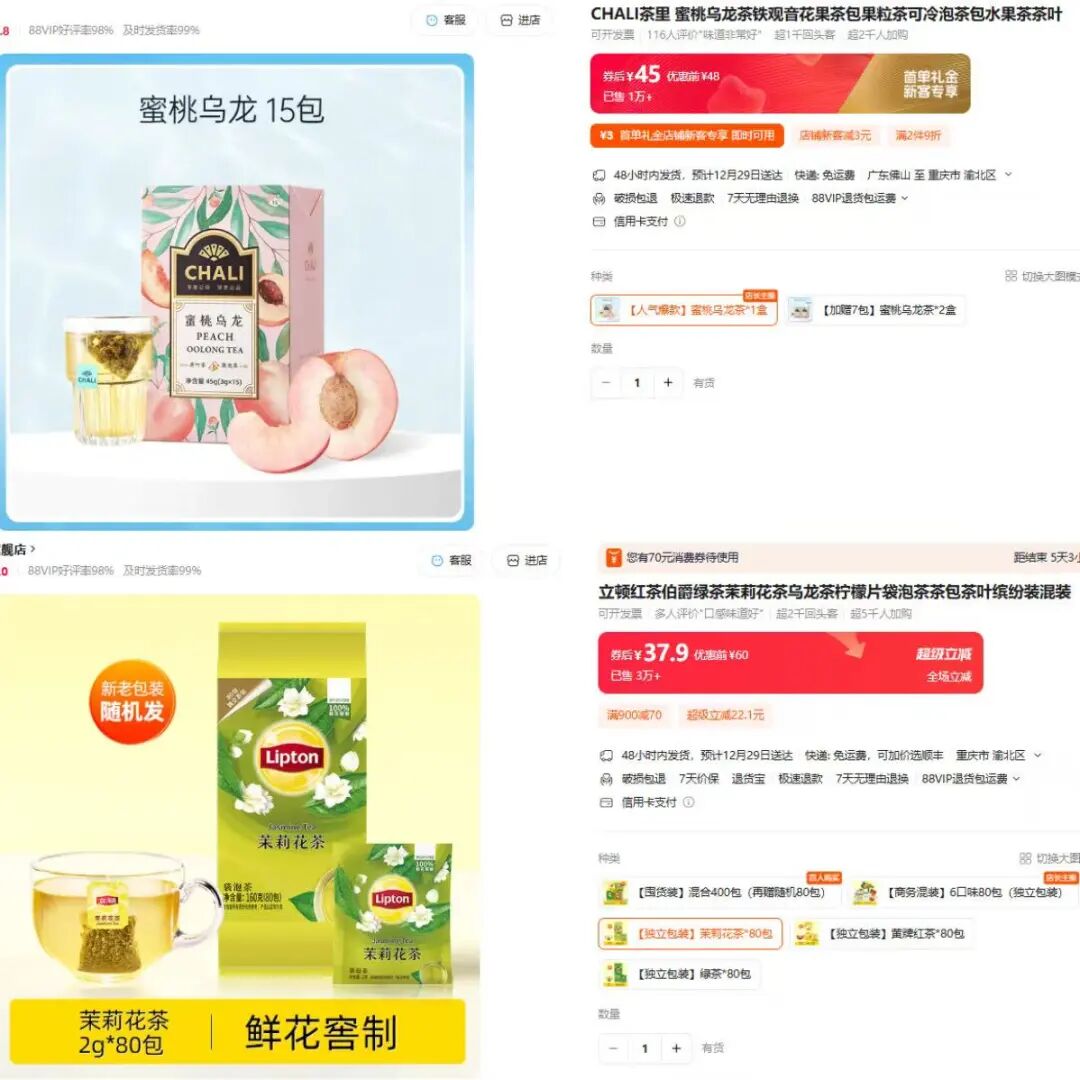 CHALI明星單品蜜桃烏龍袋泡茶、立頓茉莉花茶袋泡茶 圖源:天貓平臺(tái)