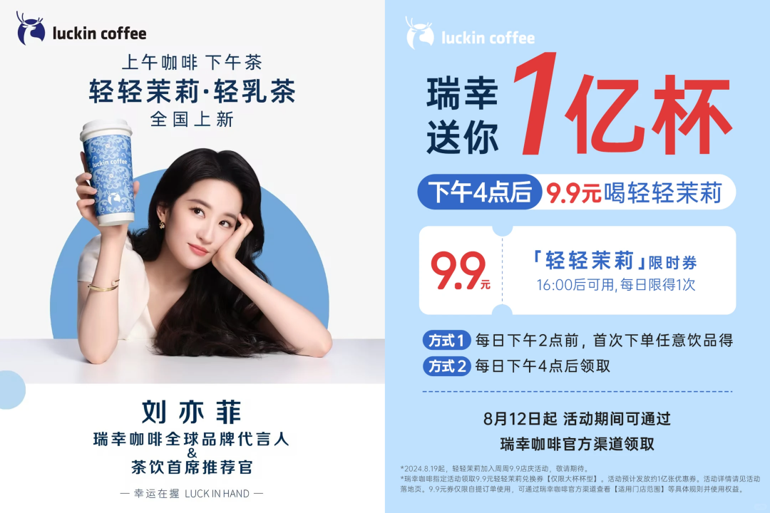 2024年8月,瑞幸推出年度重磅新品“輕輕茉莉輕乳茶”,并正式提出“上午咖啡下午茶”的口號(hào)。同時(shí),官宣劉亦菲為全球品牌代言人及茶飲首席推薦官,一次性觸達(dá)龐大的路人基本盤。新品上線首月就賣了4400萬+杯,在茶飲市場(chǎng)砸下一枚重磅炸彈。