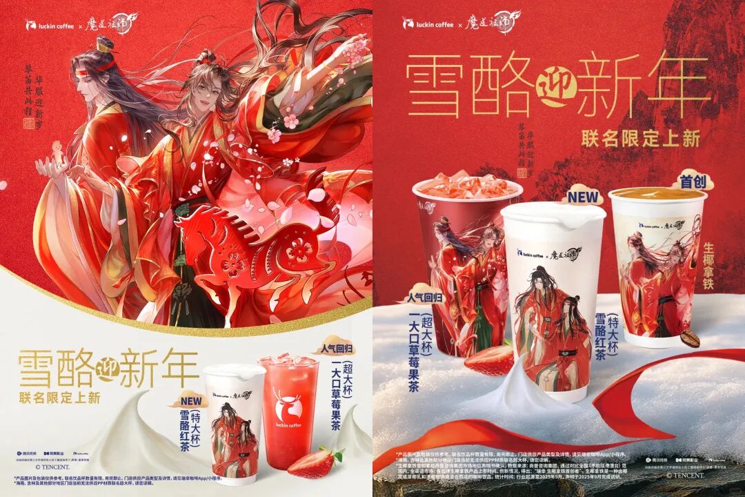 1月5日,瑞幸攜手國(guó)漫IP《魔道祖師》,以“華服迎新歲,琴笛共此程”為主題,正式推出雪酪紅茶、一大口草莓茶兩款非咖新品,并同步首發(fā)三款限定周邊。