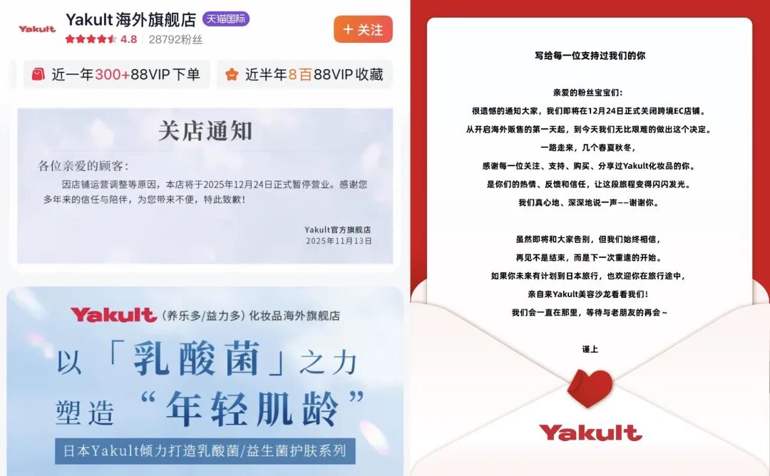 此外,跨界而來的日妝品牌也難逃“閉店劫”。就在前段時間,養(yǎng)樂多集團(tuán)旗下乳酸菌個護(hù)品牌Yakult在其官方小紅書、天貓國際海外旗艦店(粉絲數(shù)為2.88萬)均發(fā)布閉店通知,宣布于12月24日正式關(guān)閉跨境EC店鋪,其表示此系“無比艱難的決定”,這也意味著其結(jié)束超5年的在華的海外販?zhǔn),將專注于日本市場?/p>