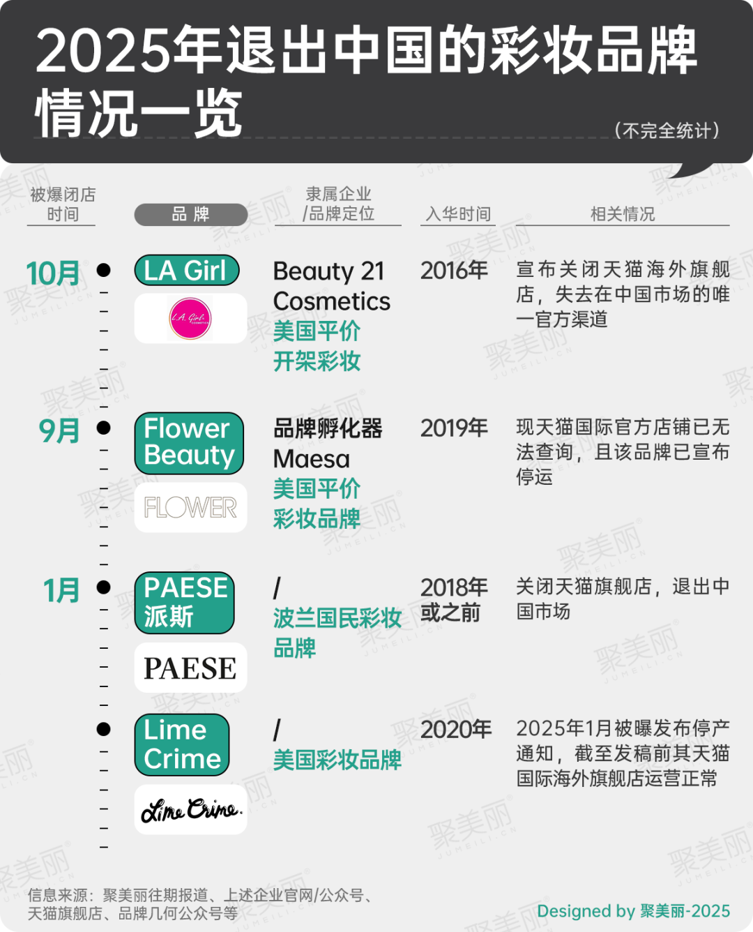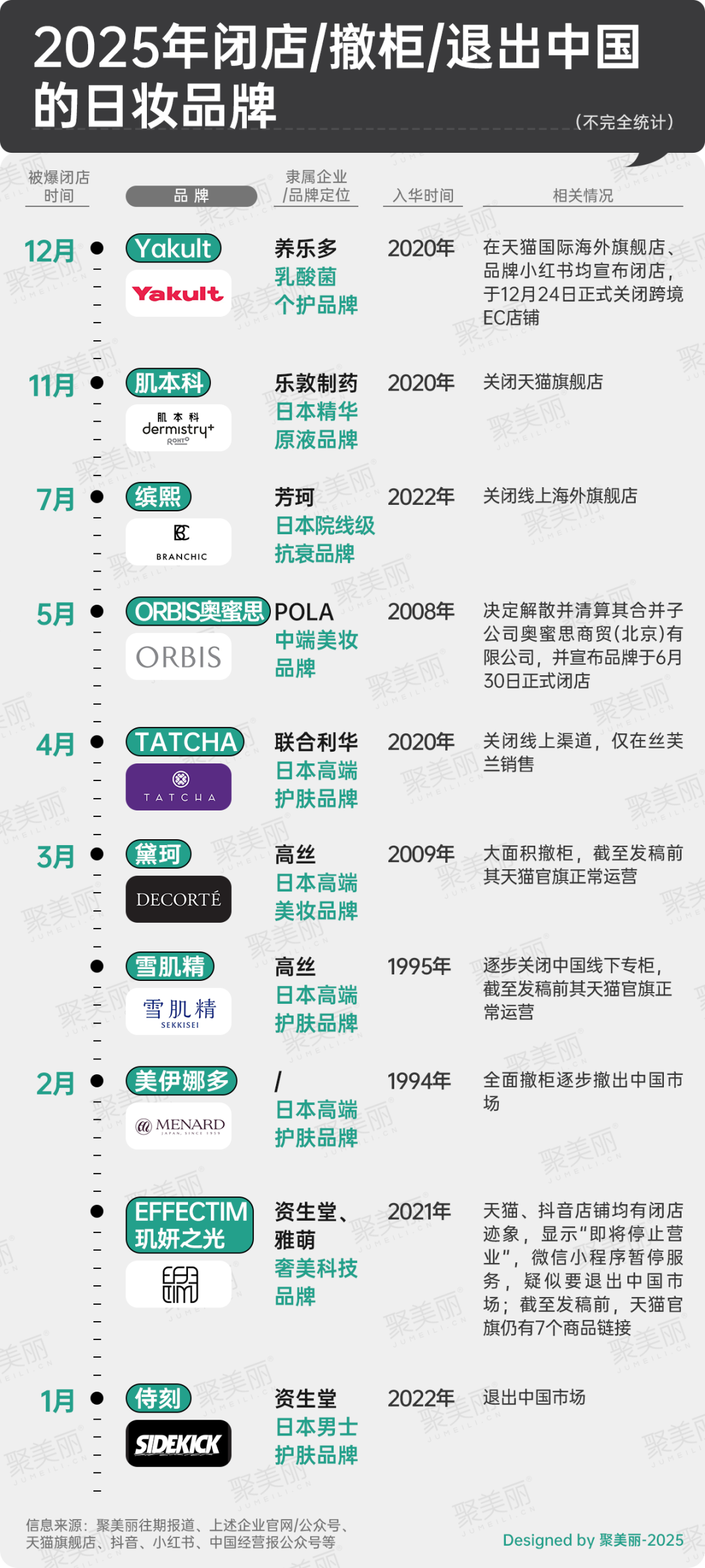 據(jù)聚美麗不完全統(tǒng)計,2025年共有10個日妝品牌在華敗北,依相關(guān)情況進(jìn)行粗略統(tǒng)計,大致可以分為閉店、撤柜、退出中國市場三類。