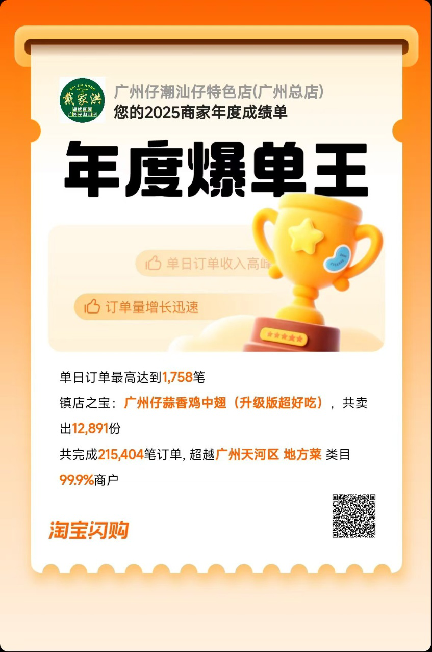 全國爆單王廣州仔潮汕大排檔一天最高做到1700多單,全年訂單超過21萬!耙郧叭站400多單,現(xiàn)在淘寶閃購一天能做到1200多單,晚市的訂單能占到近七成”,廣州仔潮汕仔特色店主理人戴老板介紹。