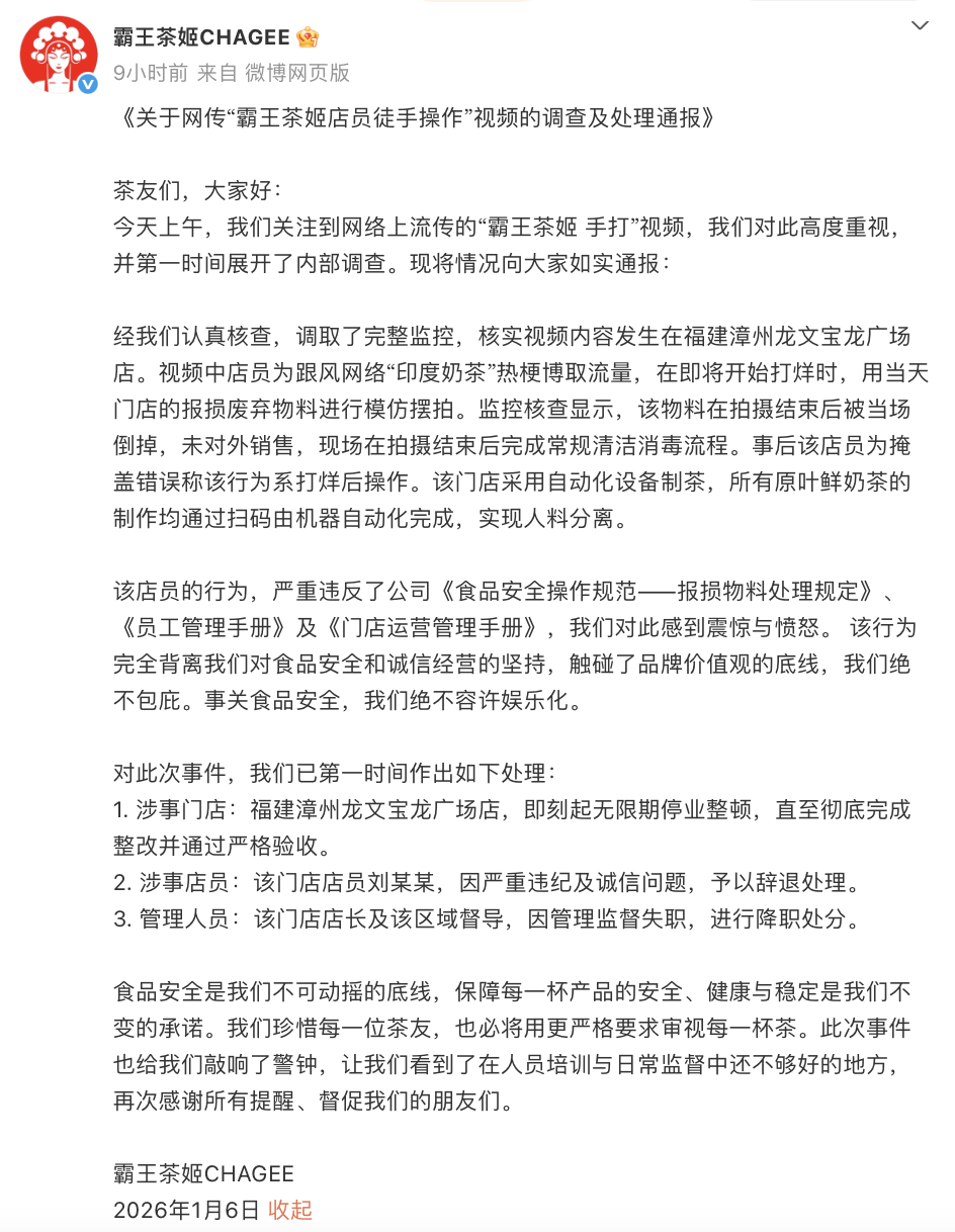 隨后,@霸王茶姬CHAGEE 發(fā)布關(guān)于網(wǎng)傳“霸王茶姬店員徒手操作”視頻的調(diào)查及處理通報,相關(guān)話題再次登上熱搜第一。