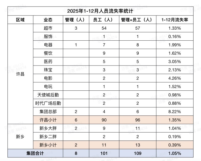 數(shù)據(jù)顯示,2025年,胖東來集團合計流失109人,其中包括8名管理人員及101名員工,人員流失率僅為1.05%,較2024年的2.01%實現(xiàn)大幅下降,也遠低于中國零售行業(yè)平均水平。