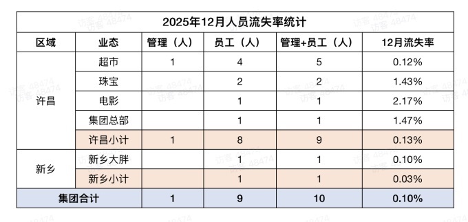 從區(qū)域來看,許昌地區(qū)2025年全年流失率為1.35%,新鄉(xiāng)地區(qū)為0.39%,均較2024年有明顯優(yōu)化。特別是在2025年12月單月,集團整體流失率僅為0.10%,表現(xiàn)出較強的年末人員穩(wěn)定性。