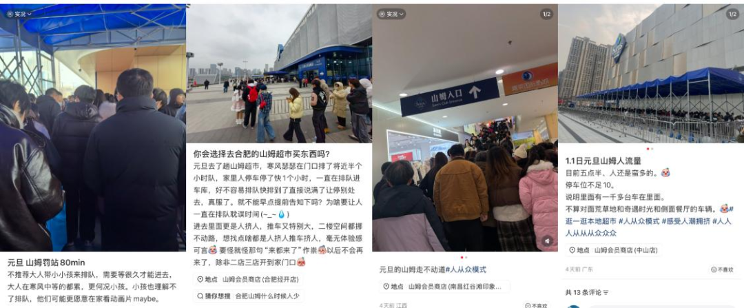 這樣的場景在全國山姆門店同步上演:南京排隊超80分鐘,合肥進(jìn)車庫需半小時,中山停車場停滿上千臺車,大連山姆排隊45分鐘……