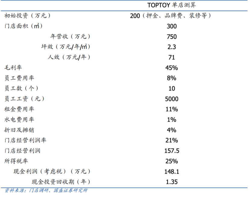 2024年,TOP TOY在中國(guó)內(nèi)地實(shí)現(xiàn)GMV 24億元,3年復(fù)合年增長(zhǎng)率超過50%,是國(guó)內(nèi)增長(zhǎng)最快的潮玩集合品牌。其單店模式已趨于成熟,加盟或直營(yíng)的初始投資約150-200萬(wàn)元,涵蓋裝修、首批鋪貨、設(shè)備及品牌保證金等費(fèi)用。單店回本周期約1.35-2.5年:若按年?duì)I收750萬(wàn)元、毛利率45%、凈利潤(rùn)率21%計(jì)算,回本周期約1.35年;即便按保守估計(jì)的年?duì)I收860萬(wàn)元、較低凈利潤(rùn)率計(jì)算,回本周期也僅延長(zhǎng)至2.5年。