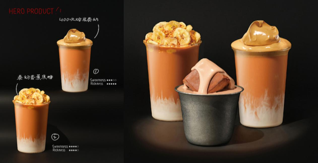 比如當(dāng)下人氣高漲的泰柯茶園招牌產(chǎn)品“咸法酪泰奶”,通過濃郁咸香的奶酪中和了泰奶本身的甜度。BLACK TREE·泰茶的招牌“400次熔巖泰奶”則將泰奶與咖啡、芝士酪乳相互融合,調(diào)和甜味的同時,使飲品層次和口感更加豐富。