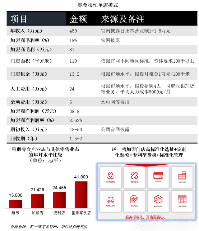 以零食很忙110平方米的標(biāo)準(zhǔn)店為例,店內(nèi)有1000-1300個(gè)SKU,消費(fèi)者單次消費(fèi)金額約25元,一家店一天的銷售額可以達(dá)到1-1.5萬(wàn)元,剔除節(jié)假日影響后,一年綜合收入可達(dá)450萬(wàn)元。加盟商毛利率約18%,一年毛利能達(dá)到81萬(wàn)元?鄢饨、水電、雜費(fèi)等運(yùn)營(yíng)成本后,年凈利潤(rùn)約38.8萬(wàn)元。單店前期投入約50萬(wàn)元,其中裝修12萬(wàn)元、設(shè)備7-12萬(wàn)元、首批進(jìn)貨18-25萬(wàn)元,加上總部補(bǔ)貼后,實(shí)際現(xiàn)金支出可下降20%-30%。投資回報(bào)期為18-24個(gè)月,之后每年凈利潤(rùn)約40萬(wàn)元,遠(yuǎn)超大部分金融理財(cái)產(chǎn)品的收益。其平效高達(dá)41000元/平方米,遠(yuǎn)高于普通便利店。