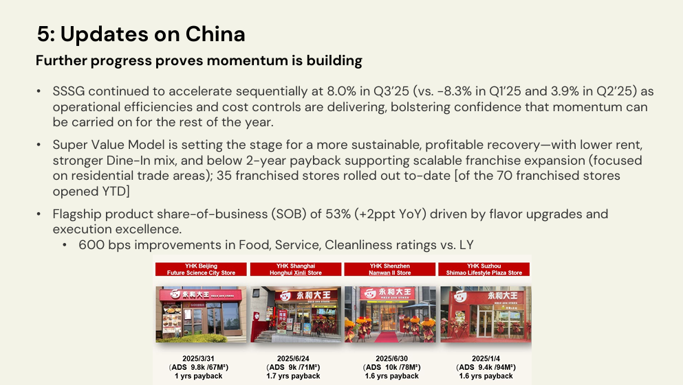 目前,添好運(yùn)將重點(diǎn)市場(chǎng)放在了香港地區(qū),并取得較好的收益。據(jù)Shin透露,2025年第三季度,添好運(yùn)的EBITDA現(xiàn)金貢獻(xiàn)增長(zhǎng)了4倍,距離2025年年初增長(zhǎng)了3倍。同時(shí),在香港新開的所有添好運(yùn)門店都能在2年內(nèi)回本,并已全部實(shí)現(xiàn)盈利。