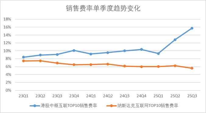 圖:中概互聯(lián)及納斯達(dá)克頭部企業(yè)銷售費(fèi)率,來源:Choice金融客戶端