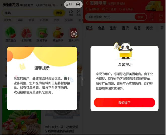 第一是美團優(yōu)選的全面關(guān)停,事實上,在晚點報道多多的三天后,美團優(yōu)選在全國大量省市的服務(wù)就突然終止,僅;浾愕攘阈菂^(qū)域維持運轉(zhuǎn),當(dāng)時美團稱只是進(jìn)行了局部地區(qū)調(diào)整,將推動優(yōu)選戰(zhàn)略轉(zhuǎn)型升級,繼續(xù)探索社區(qū)零售零售業(yè)態(tài),但實際到去年12月15日,美團優(yōu)選最后運營區(qū)域已經(jīng)跟旗下團好貨一起完全關(guān)停了。