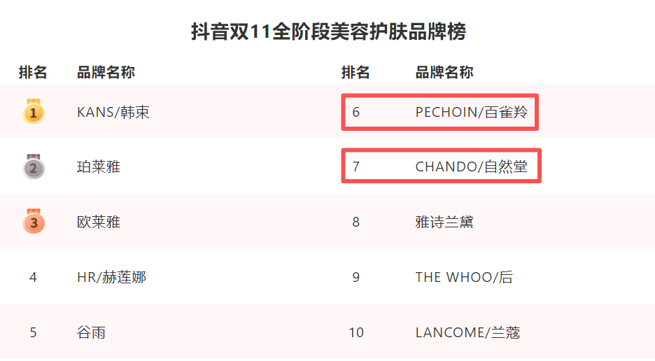 2023年,抖音雙11曾單獨開設“彩妝香水榜”,TOP 10中新銳國貨品牌一度占據(jù)4席,花西子、彩棠、方里、柳絲木等均位列其中。但2024-2025年,平臺將彩妝與護膚合并為“美妝”統(tǒng)計時,這些品牌便集體從總榜上消失了。