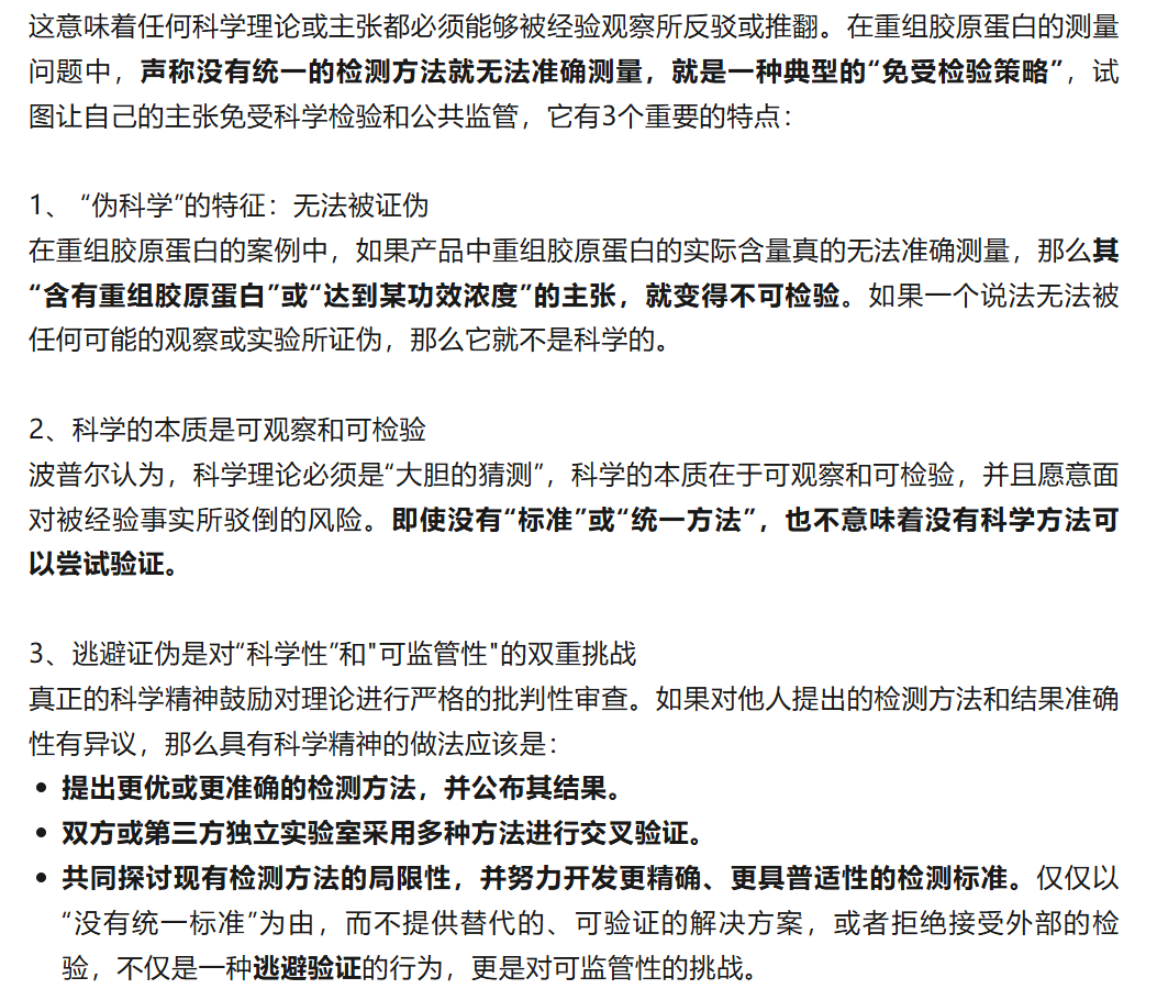 令人玩味的是,華熙生物最終檢測了自家產(chǎn)品的重組膠原蛋白成分,并提出了關于檢測方法的建議。一招“隔山打!保逦匦媪藸帄Z的實質:并非較真成分,而是關于定義標準的權威之戰(zhàn)。