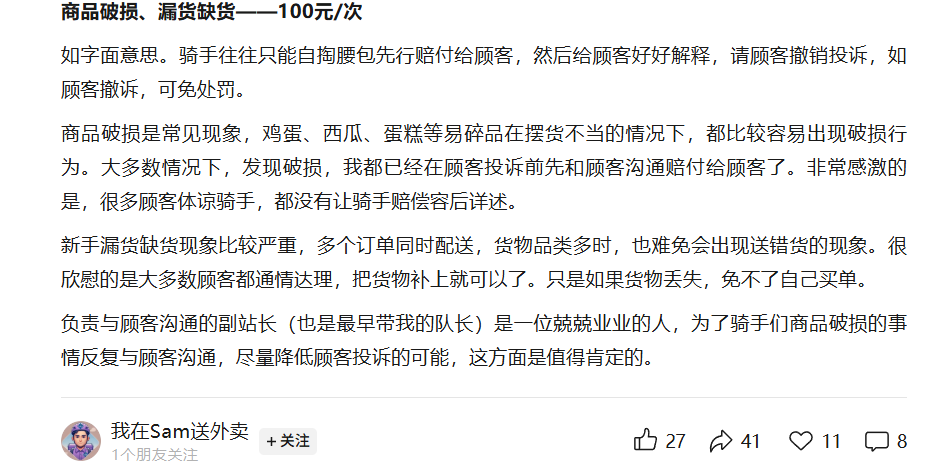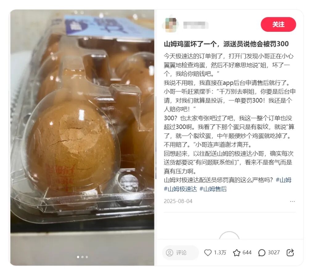 員工這邊也傳出了與壓力有關的消息。2024年開始,山姆配送員“弄碎一個雞蛋賠300”、“弄碎三個雞蛋賠1000”等說法流傳。山姆的賠償金已經遠遠高于極兔快遞員的賠償金額了。有自稱是山姆的配送員表示,漏貨或缺貨需要面臨100元賠償。