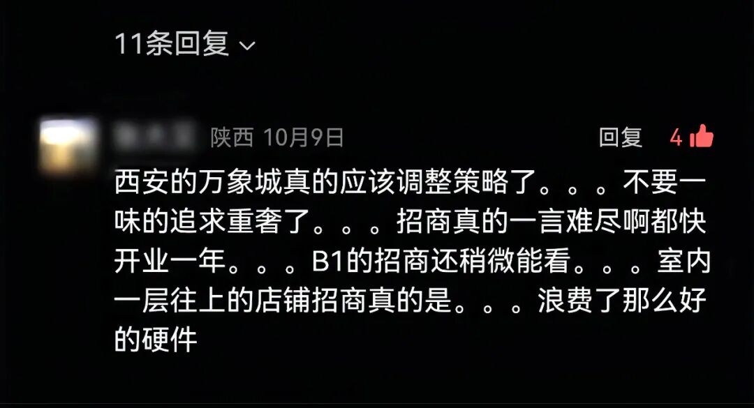 2025年10月初,當(dāng)我們發(fā)布《浙江第一座萬象天地,有何與眾不同》的專題文章時(shí),有陜西讀者在留言區(qū)有感而發(fā),描述了西安萬象城當(dāng)下的尷尬,也表達(dá)了對于西安萬象城現(xiàn)狀的擔(dān)憂。