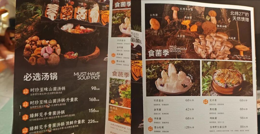 職餐記者了解都其他品牌,菌菇鍋底要在98-226元之間,見手青要68元/份,雞樅菌要98元/份。
