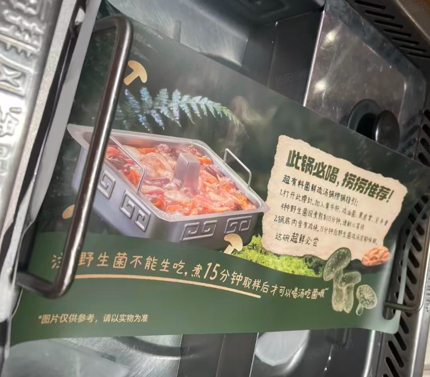 店內(nèi)的墻面、餐桌立牌也隨處可見“食菌尋鮮記,鮮來海底撈”的宣傳標語。