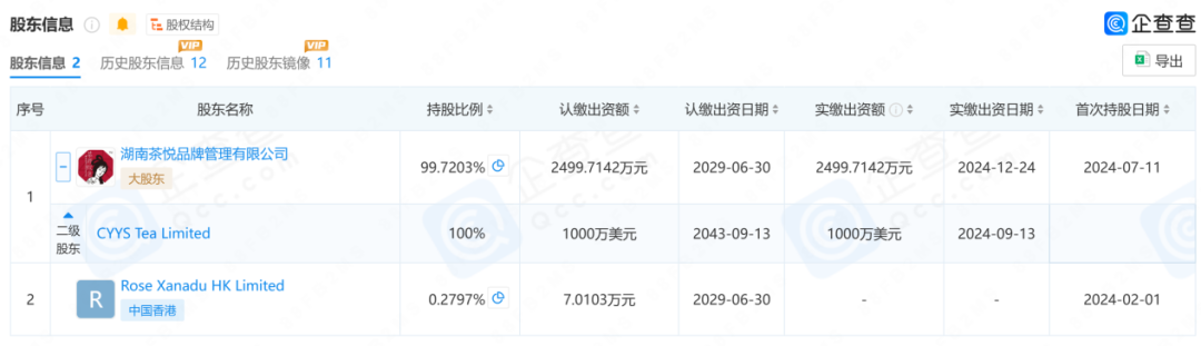 同年7月,湖南茶悅文化新增湖南茶悅品牌管理有限公司為股東,該公司法定代表人為茶顏悅色創(chuàng)始人呂良,注冊資本1000萬美元,由注冊于香港的CYYS Tea Limited全資持股。