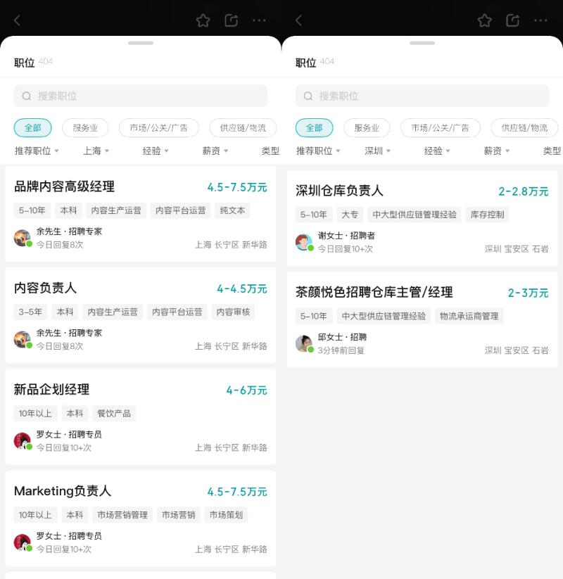 近日,BOSS直聘信息顯示,茶顏悅色正在上海、深圳開啟崗位招聘。在上海,茶顏悅色以4.5萬~7.5萬元的月薪招聘Marketing(市場)負(fù)責(zé)人,4.5萬~7.5萬元的月薪招聘品牌內(nèi)容高級經(jīng)理;在深圳,茶顏悅色以2萬~3萬元的月薪招聘倉庫主管與經(jīng)理、2萬~2.8萬的月薪招聘倉庫負(fù)責(zé)人。