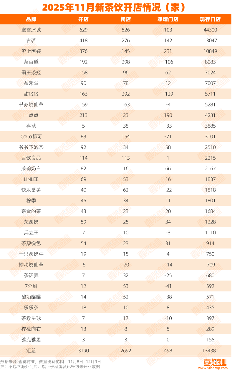 然而,外拓之路并非坦途。無論是上海還是深圳,茶飲市場競爭都已白熱化。茶咖觀察數(shù)據(jù)顯示,截至2025年12月9日,30個連鎖茶飲品牌在華南市場布局超1.87萬家門店,占全國門店的近14%。僅廣東一省,這些品牌的門店總量已超過1.28萬家,其中,霸王茶姬、茉莉奶白與爺爺不泡茶的門店數(shù)量就分別高達(dá)728家、257家與162家,此外,深圳還是喜茶、奈雪的茶和茉莉奶白等茶飲品牌的大本營。