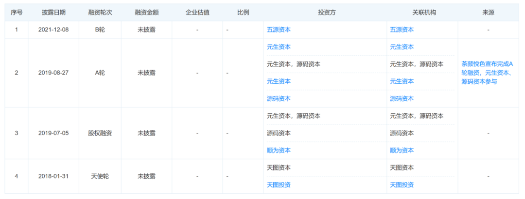 成立于2013年的茶顏悅色,曾憑借首創(chuàng)的“新中式鮮茶”概念、國風(fēng)品牌形象迅速走紅,2018年至2021年,茶顏悅色接連收獲來自天圖投資、順為資本、元生資本、源碼資本等機(jī)構(gòu)的四輪融資。