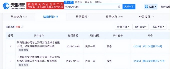 天眼查APP數(shù)據(jù)顯示,鴨鴨股份公司司法案件數(shù)量高達(dá)185件,其中最近的兩起案件均涉及商標(biāo)權(quán)或著作權(quán)糾紛。