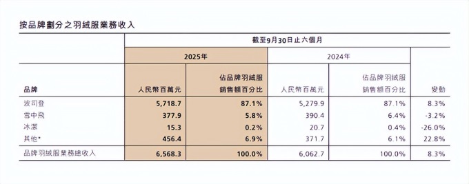 根據(jù)波司登2025/26年中期報(bào)告顯示,截至2025年9月30日,雪中飛占品牌羽絨服銷售額百分比為5.8%,而冰潔更差,占比僅為0.2%。而且比起2024財(cái)年同期,雪中飛和冰潔的收入還出現(xiàn)了下滑,下滑幅度分別為3.2%和26%。