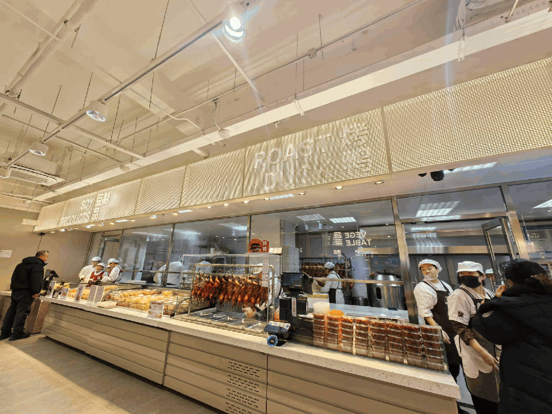 首先是自營(yíng)項(xiàng)目,有“食光驛站”“手作食鋪”和“自制工坊”,包含的烤羊肉串、烤牛肉干及肇東小餅等,透過(guò)玻璃,顧客不僅可以看見(jiàn)原料,還可以清晰地看到員工分割、腌肉、切丁、串串及燒烤,讓顧客能清晰感受到加工過(guò)程。