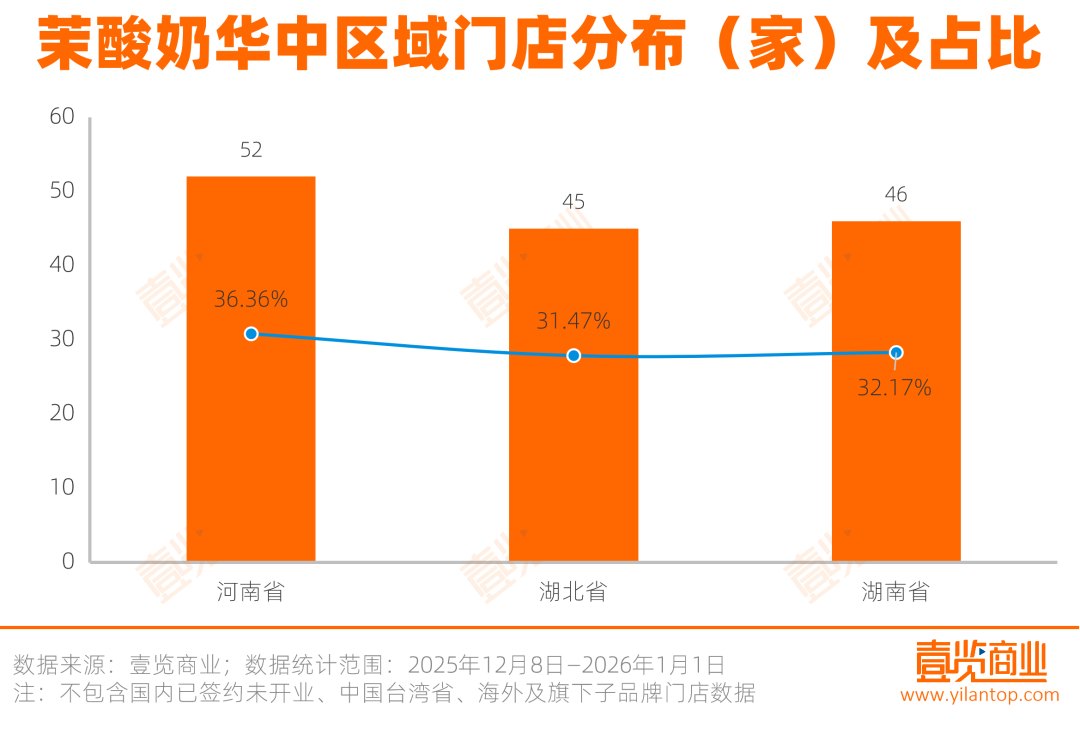 在華中區(qū)域,茉酸奶的門店分布呈現(xiàn)出三足鼎立的格局,河南、湖北、湖南占比均在30%上下。
