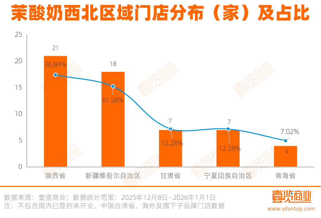 在西北區(qū)域,新疆與陜西一起占據(jù)了近七成市場(chǎng),青海是區(qū)域內(nèi)門店數(shù)量最少的,只有3家門店。