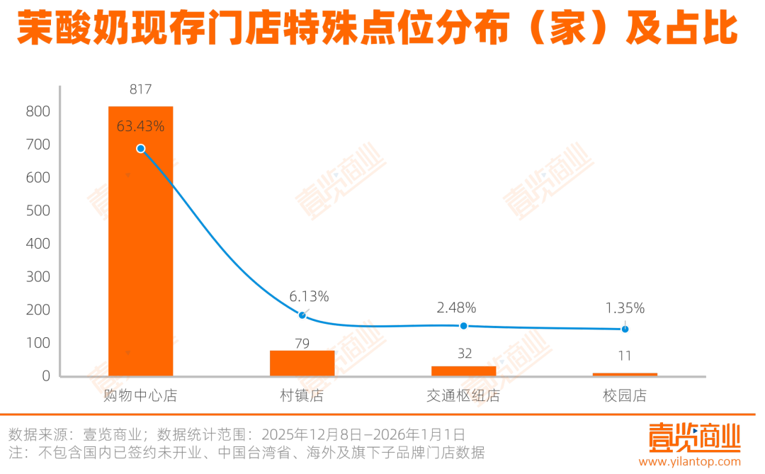 茉酸奶的門店選址則呈現(xiàn)鮮明的聚集性。購(gòu)物中心門店數(shù)量高達(dá)817家,占比63.43%,品牌希望通過購(gòu)物中心點(diǎn)位穩(wěn)定的客流基礎(chǔ),覆蓋年輕白領(lǐng)等核心客群,同時(shí)借助綜合體的品牌聚合效應(yīng)提升自身曝光度。