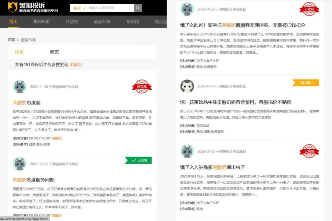 二是茉酸奶的品牌口碑面臨考驗(yàn)。打開黑貓投訴平臺(tái),共有481條投訴中包含搜索詞茉酸奶,最近的幾條投訴內(nèi)容都是聚焦于茉酸奶的服務(wù)態(tài)度差,往下翻看可以看到關(guān)于眾多食品安全問題以及外賣騎手相關(guān)問題的投訴內(nèi)容,對(duì)品牌形象形成持續(xù)消耗。