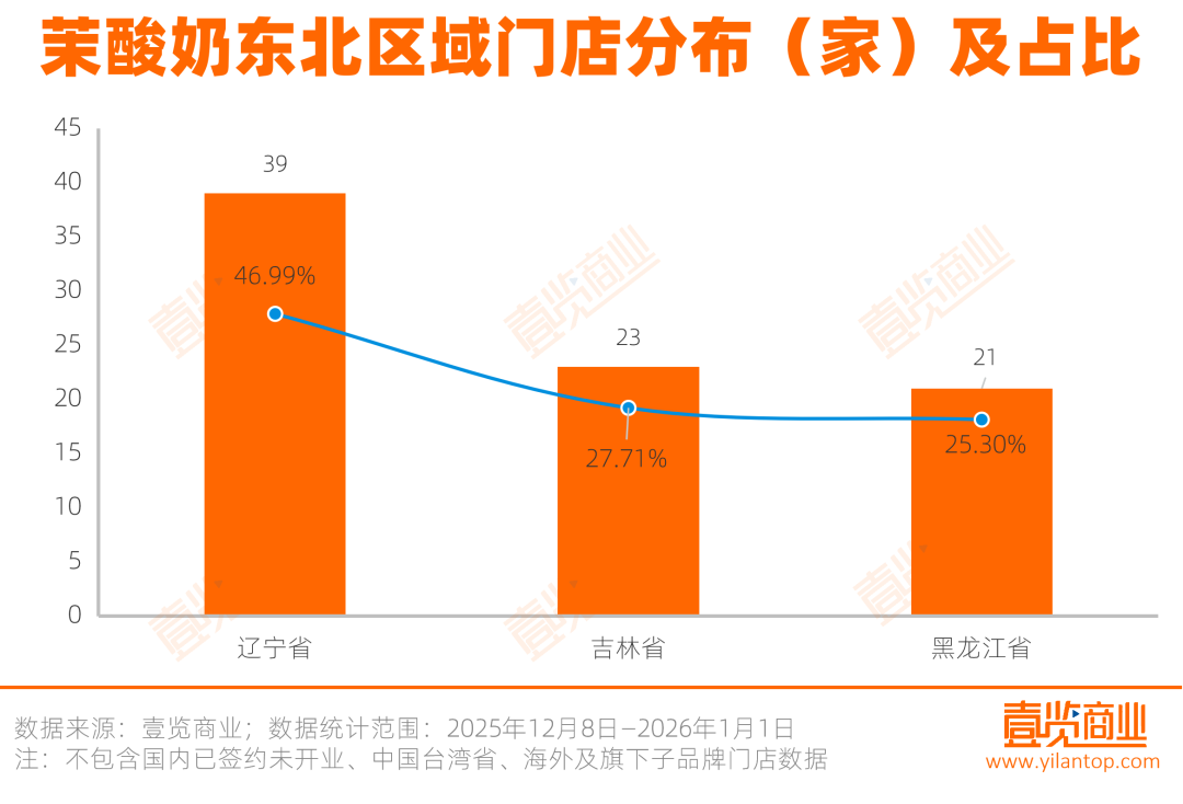 在東北區(qū)域,遼寧省37家門店占區(qū)域總數(shù)的46.84%,門店規(guī)模接近于黑龍江省和吉林省之和,黑龍江省和吉林省十分均衡,各擁有21家門店,合計(jì)占比53.16%。