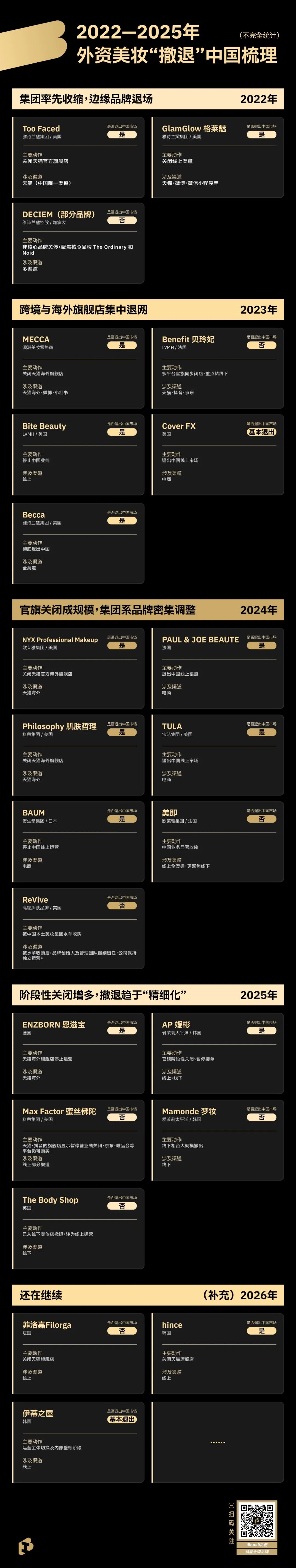 因此,無論是外資還是國貨品牌,能夠留下來的,只會是那些真正理解變化、具備系統(tǒng)能力,并愿意長期投入的品牌。20+外資美妝的撤退,并不是故事的終點,而是中國美妝市場不再是“簡單模式”的一個結果。
