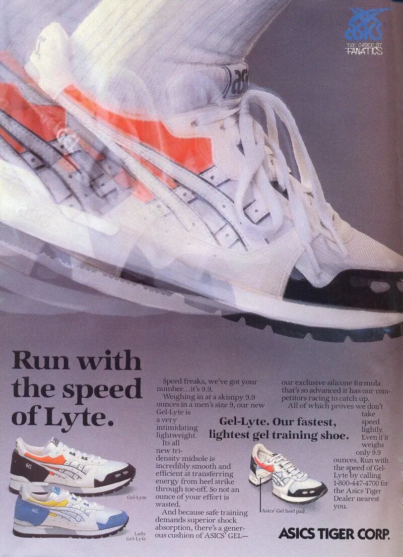 第二年,亞瑟士Gel-Lyte登陸美國,這是一款僅重9.9盎司的鞋款,是當時最輕的跑鞋,配合強勢的廣告攻勢,以及后續(xù)的幾款Gel Lyte上市,亞瑟士基本確立了在北美嚴肅跑圈中的地位。